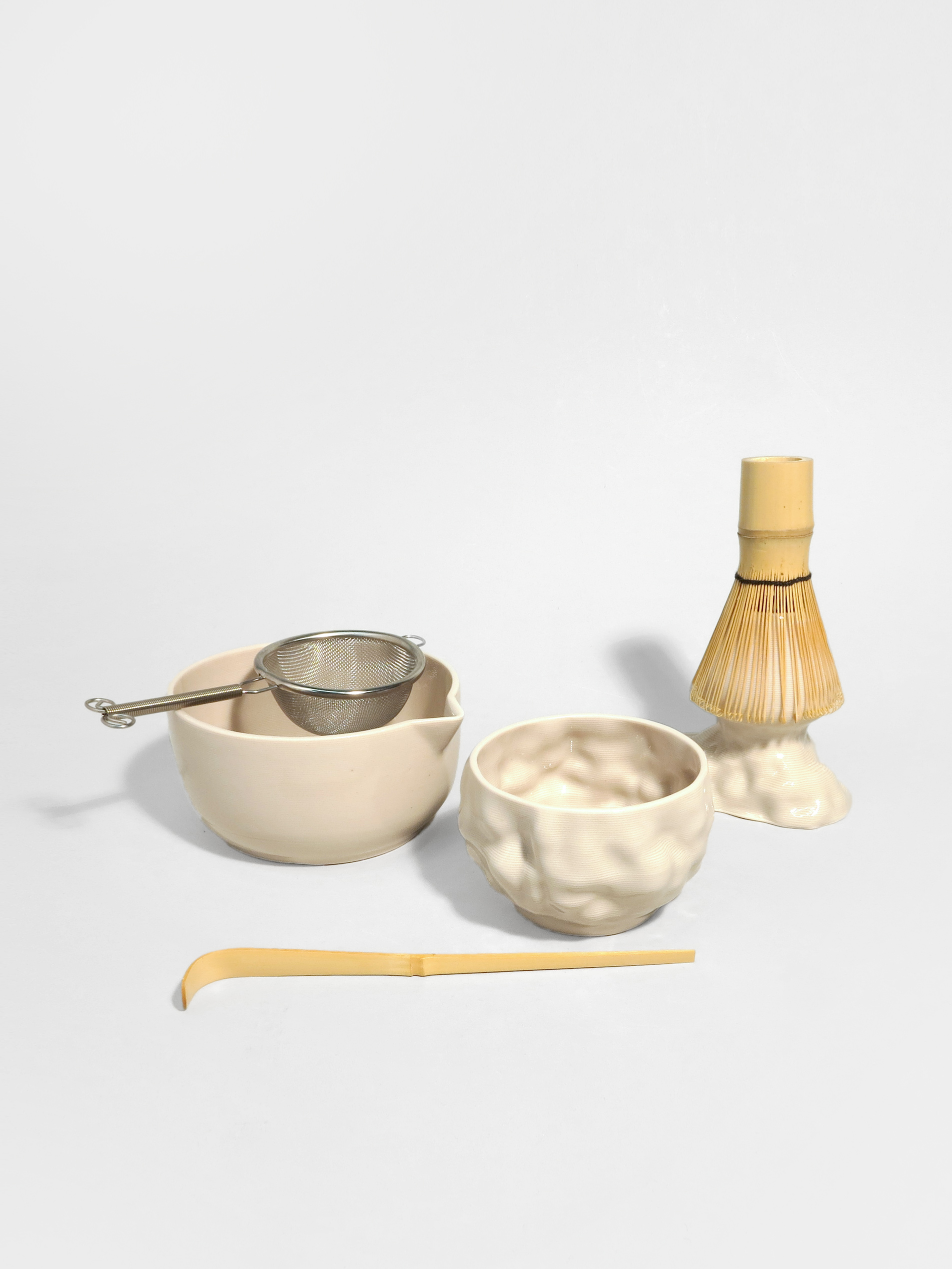 The artefacts of the Aether Matcha Set are available in two colours: a delicate, slightly lilac blue bringing the hues of an evening sky to the objects and a subtle cream tone evoking the fine sand of an undefined Mediterranean location. Both colours catch the atmospheric tranquility at Aether Spaceand transfer them to the artefacts of the matcha set.